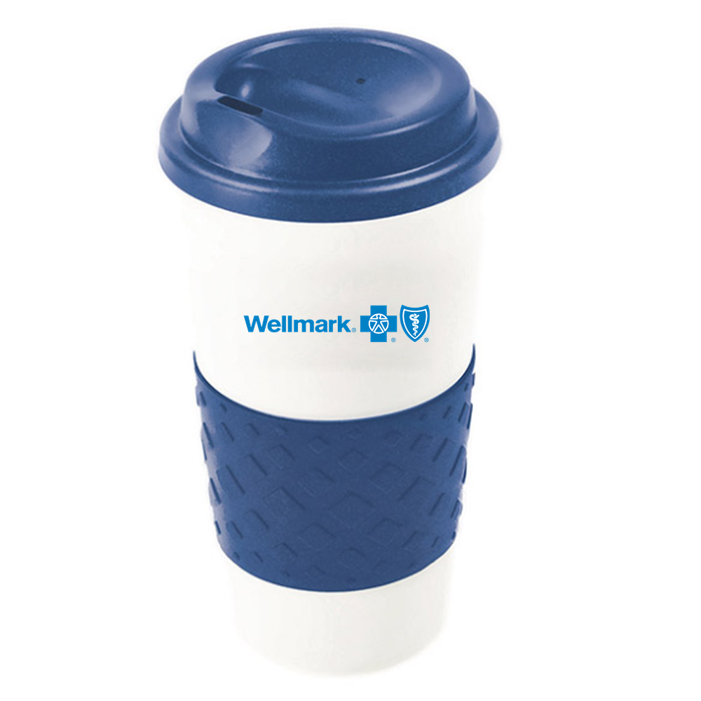 BPA-free, double-wall plastic tumbler with drink-through lid. Diamond pattern rubber grip. Holds 16 oz. Fits standard cup holders. Not intended for hot beverages; not microwave or dishwasher safe. Available in Blue with the Wellmark logo imprinted on one side.