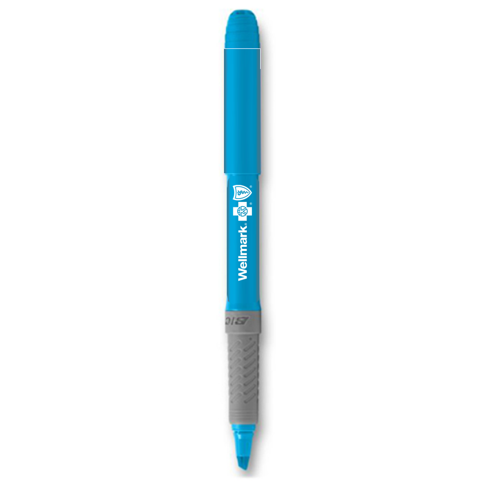 This Bic Brite Liner Grip Highlighter has a grey textured rubber grip for comfort and control. It has a chisel tip for broad highlighting and fine underlining and is ACMI approved non-toxic. The Wellmark logo is on the barrel.