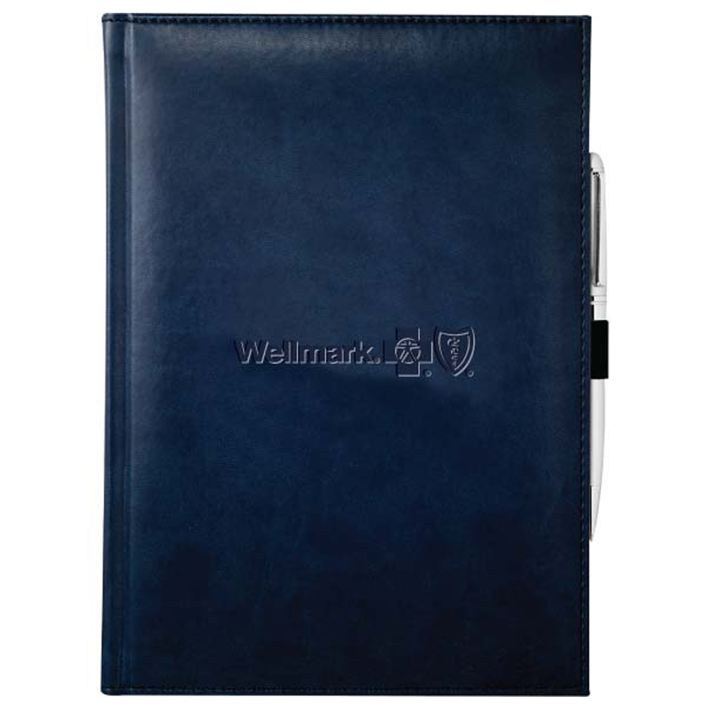 Elastic pen loop. Blue and silver ribbon page markers. Includes 125 sheets of lined paper. Pen is not included. The Wellmark logo is debossed on the front cover.
