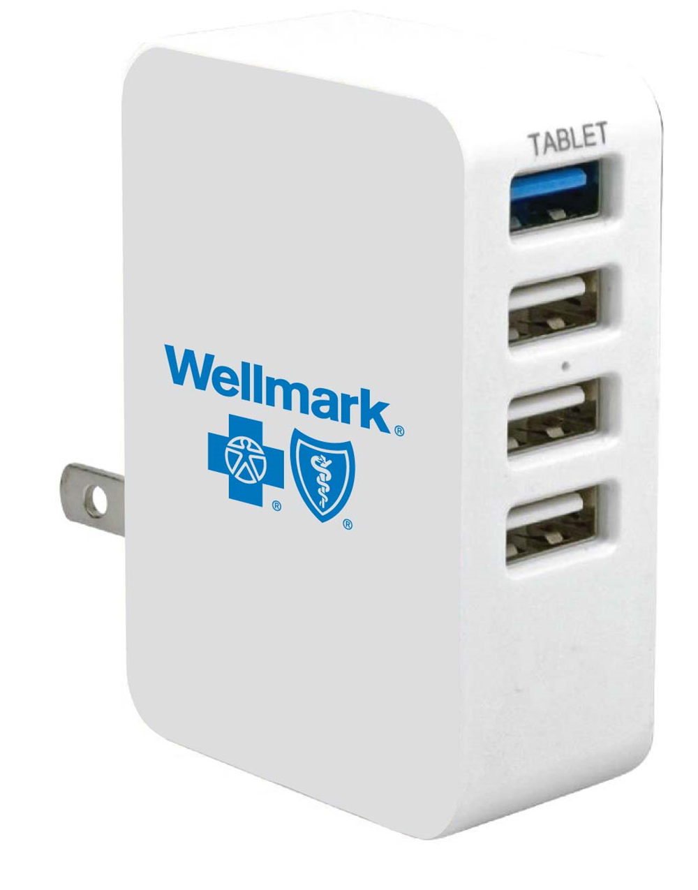 4 port USB Charging Station; UL ListedCompact Design with folding prongs; 3 A outputĀ The Wellmark logo is imprinted in blue on the power charger.