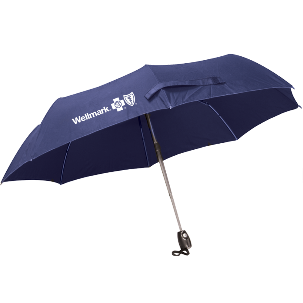 Our mini polyester 43" arc umbrella automatically opens and closes with the touch of a button and folds to a compact 11" long. Features steel shaft, windproof steel frame, nylon sheath case and your one color, one location logo imprint. Available with the Wellmark logo imprinted in white.