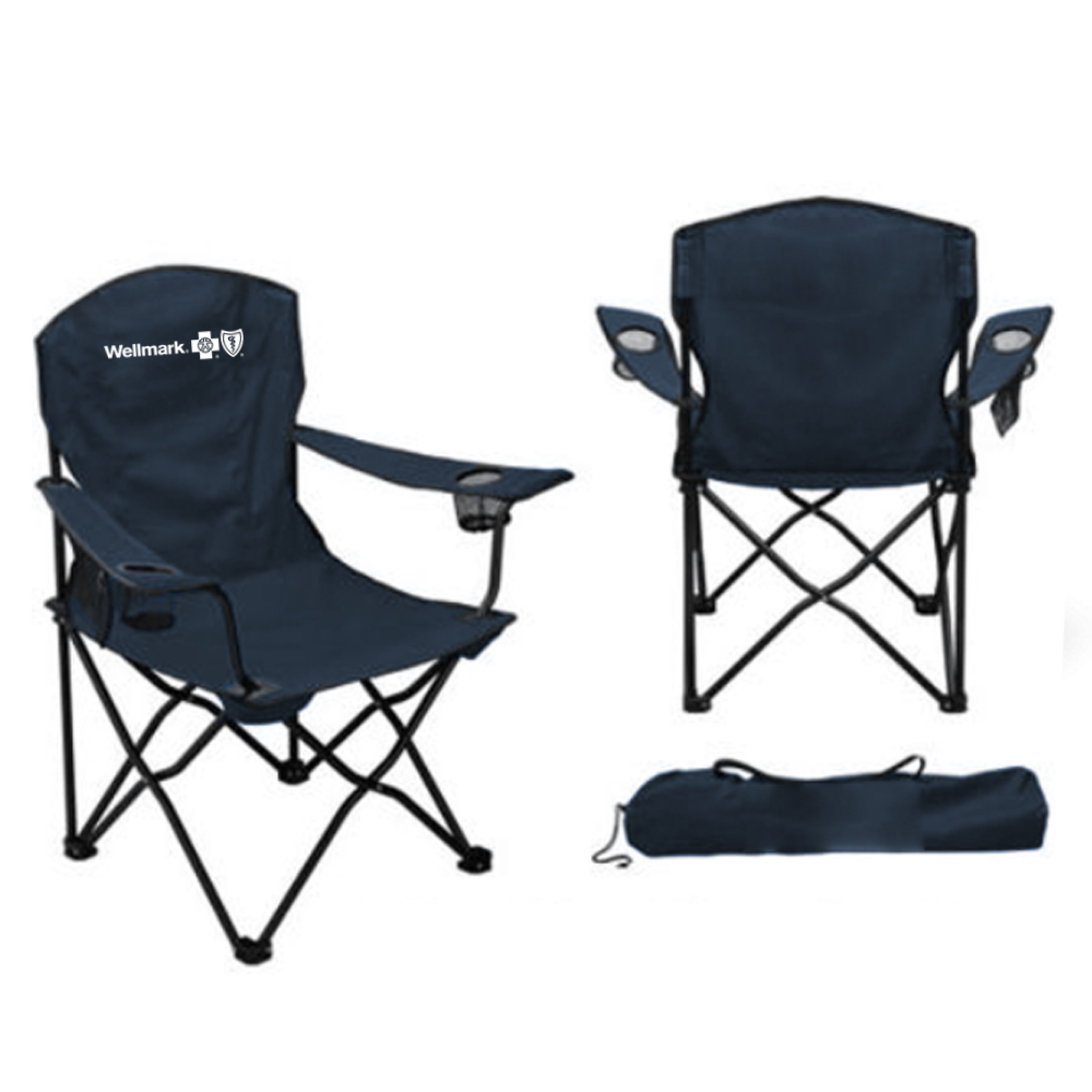 Relax in the great outdoors in the privacy of your own back yard, at the lake or your favorite game! More than a chair, it features 2 can holders and its own carrying case. Folding chair with arms has a 300 lb. weight limit. Comes inserted with 210D Polyester carry bag with strap and drawstring. The Wellmark logo is imprinted in white on the back of the chair.