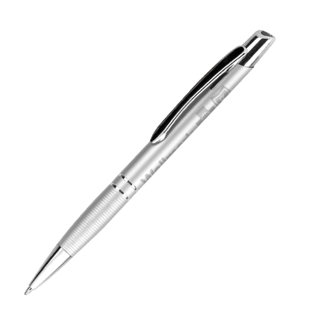 A sharp, clean metal pen design with fine detailing and knurled non-slip grip. Pen includes premium black ink cartridge. The Wellmark Advantage Health Plan logo is engraved on the barrel of the pen.